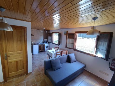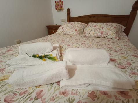 Tiene 50 m2 distribuidos en una habitación independiente con cama de matrimonio, dos mesillas , cómoda y armario empotrado con perchas . Ropa de cama, edredón con funda nórdica y sabanas . Posibilidad de sofá - cama con previo aviso ( Y suplemento a consultar).