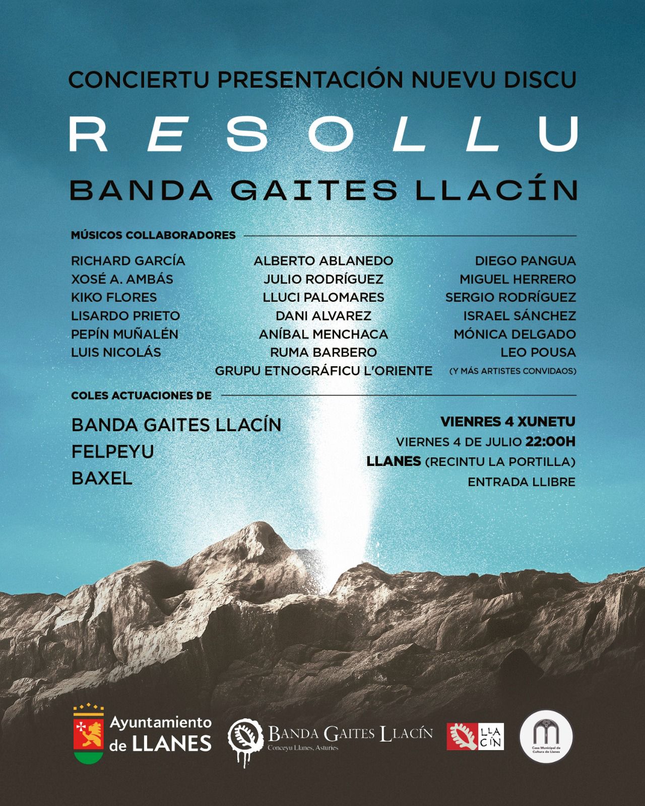 El concierto Resollu va a suponer una importante puesta en escena de la Banda Gaites Llacín que cuenta con el apoyo, la organización conjunta y el patrocinio del Ayuntamiento de Llanes.